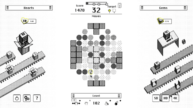Created from the ground up, each menu, item and graphic is hand drawn in stunning 8-bit black and white pixel art to replicate a puzzle game that could have been playable on the original Mac.